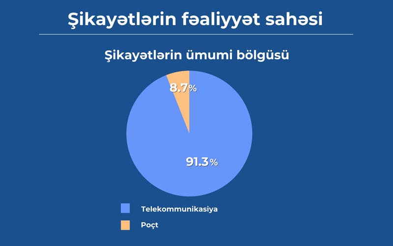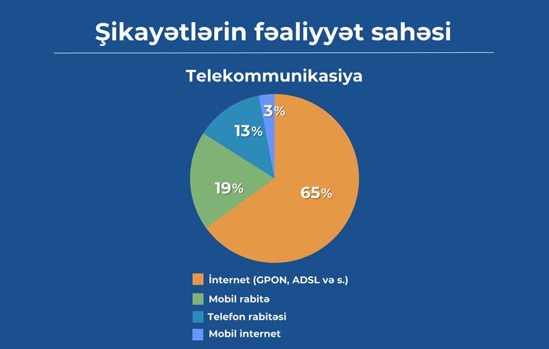 Telekommunikasiya sahəsində fəaliyyət göstərən (ümumilikdə 4 sahə – “İnternet telekommunikasiya xidmətləri (GPON, ADSL və s.)”, “Mobil internet”, “Mobil rabitə” və “Telefon rabitəsi”) 140 operator və provayderin şəxsi kabinetinə şikayətlər daxil olub. Şikayətlərin 64,61%-i sabit internet xidmətlərini əhatə edir. Mobil rabitə barəsində olan şikayətlər 19,31%, telefon rabitəsi barədə olan şikayətlər 12,96% və mobil internet barəsində olan şikayətlər isə 3,10% təşkil edir.