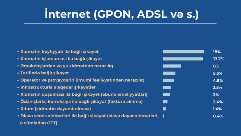 “İnternet telekommunikasiya xidmətləri (GPON, ADSL və s.)” üzrə ən geniş yayılmış “Xidmət keyfiyyəti ilə bağlı” şikayətlərdir. Bu xarakteristikaya malik şikayətlər ümumi şikayətlərin 18,02%-ni əhatə edir. İkinci yerdə 17,65%-lə “Xidmətin işləməməsi ilə bağlı” şikayətlərdir. “Əməkdaşlardan və ya xidmətdən narazılıq” alt kateqoriyası üzrə şikayətlərin həcmi 8,01%-ə bərabər olmaqla ilk üçlüyü tamamlayır. Bu 3 xarakteristika üzrə daxil olan şikayətlər internet telekommunikasiya xidmətləri üzrə ümumi şikayətlərin 43,68%-ni təşkil edir.
