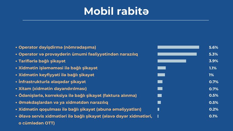 Platforma üzərindən daxil olan şikayətlərin çoxluğuna görə “Mobil rabitə” kateqoriyası ikinci yerdə qərarlaşıb. Belə ki, vətəndaş şikayətləri daha çox “Operator və ya provayderin ümumi fəaliyyətindən narazılıq” (5,25%), “Operator dəyişdirmə (nömrədaşıma)” (5,57%), və “Tariflərlə bağlı şikayət” (3,85%) alt kateqoriyalarını əhatə edir.