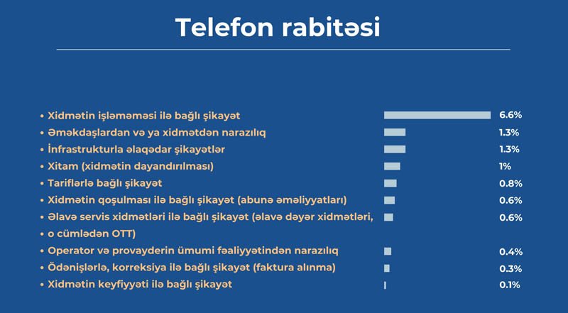 “Telefon rabitəsi” sahəsi üzrə “Xidmətin işləməməsi ilə bağlı” (6,57%), “Əməkdaşlardan və ya xidmətdən narazılıq” (1,34%) və “İnfrastrukturla əlaqədar” (1,29%) alt kateqoriyaları bu kateqoriya şikayətlərinin ilk üçlüyünü təşkil edir.