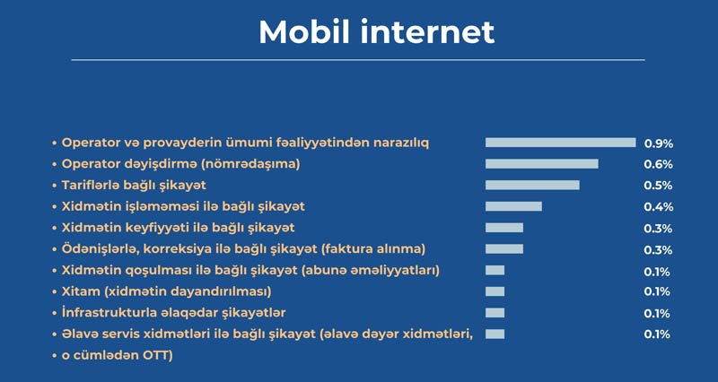 “Mobil internet” sahəsi üzrə şikayətlərdə “Operator və ya provayderin ümumi fəaliyyətindən narazılıq” (0,88%), “Operator dəyişdirmə (nömrədaşıma)” (0,6%) və “Tariflərlə bağlı şikayət” (0,54%) alt kateqoriyaları ilk 3 yeri tutur.
