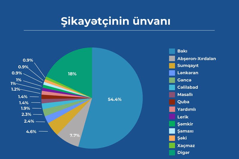 Şikayətlərin coğrafiyasına gəldikdə, 54,37% müraciət Bakı şəhərindən edilib. Eyni zamanda Abşeron – Xırdalan üzrə şikayətlərin payı 7,71%, Sumqayıt şəhəri üzrə 4,55%, Lənkəran rayonu üzrə 2,42%, Gəncə şəhəri isə 2,27% təşkil edib. Belə ki, Agentliyə daxil olan şikayətlərin ümumilikdə 71,32%-i bu 5 ərazi vahidinin payına düşüb. Digər ərazi vahidlərinin hər biri üzrə müraciətlərin faiz göstəricisi 2%-dən aşağıdır. Amma ümumilikdə müraciətlərin 18,01%-ni təşkil edir.