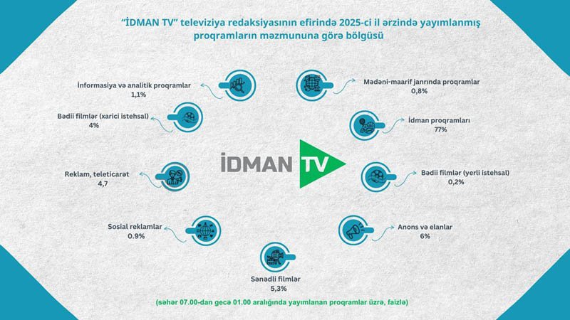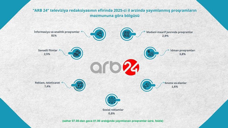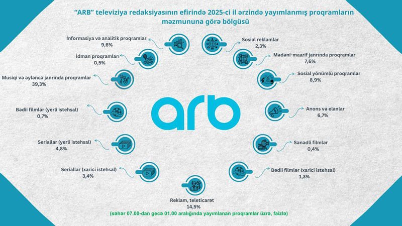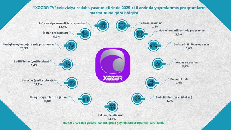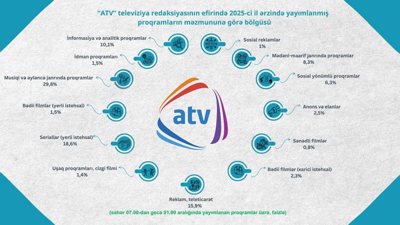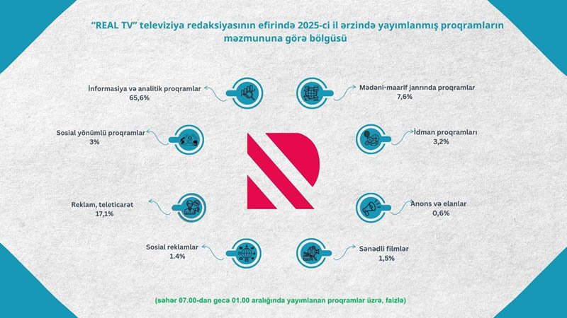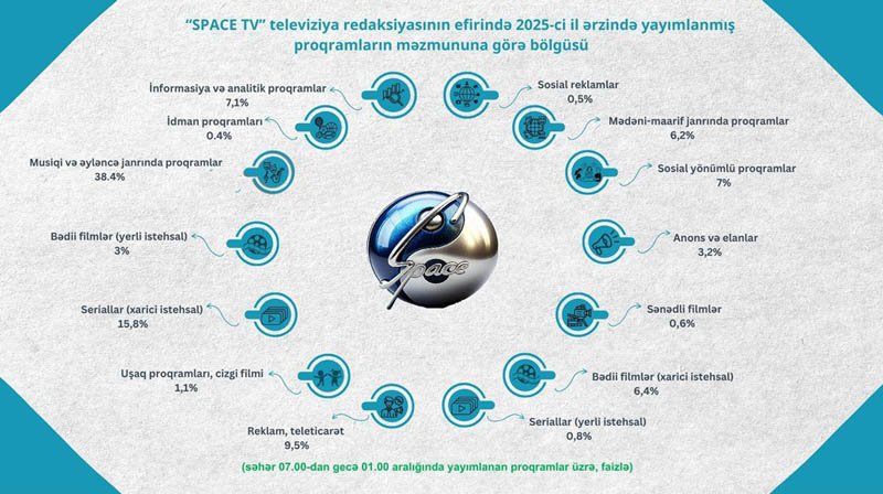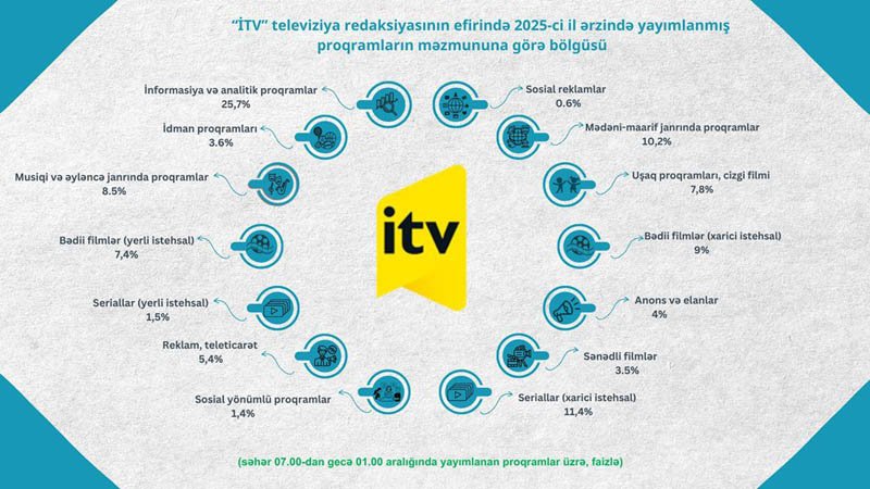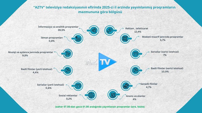 Azərbaycan Respublikası Audiovizual Şurası aparatının Audiovizual proqramların monitorinqi və təhlili şöbəsi tərəfindən 2025-ci il ərzində ümumölkə yerüstü televiziya kanallarında yayımlanmış proqramların məzmun-janr statistikası hazırlanıb.