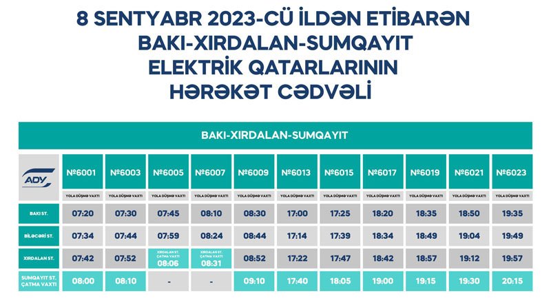 С обновленным расписанием можно ознакомиться на сайте www.ady.az, Бакинской пассажирской железнодорожной станции, всех станциях и остановках Абшеронской кольцевой железнодорожной линии, через мониторы электропоездов, а также через наши аккаунты в соцсетях.