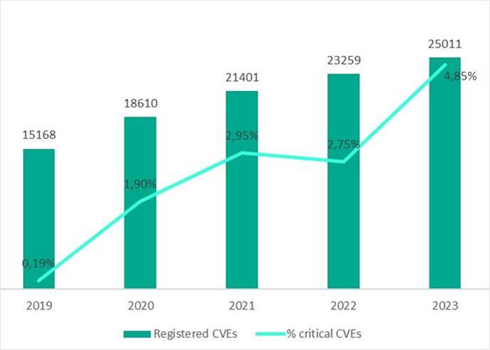 Общее число зарегистрированных уязвимостей и доля критических уязвимостей, 2019-2023 годы. Источник: cve.mitre.org