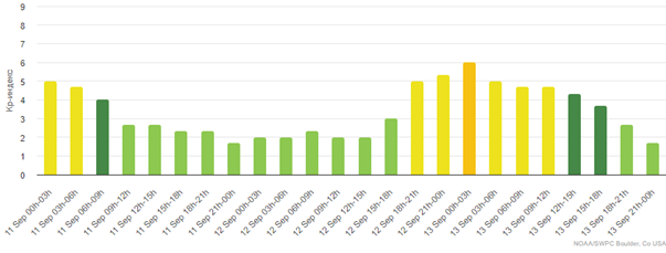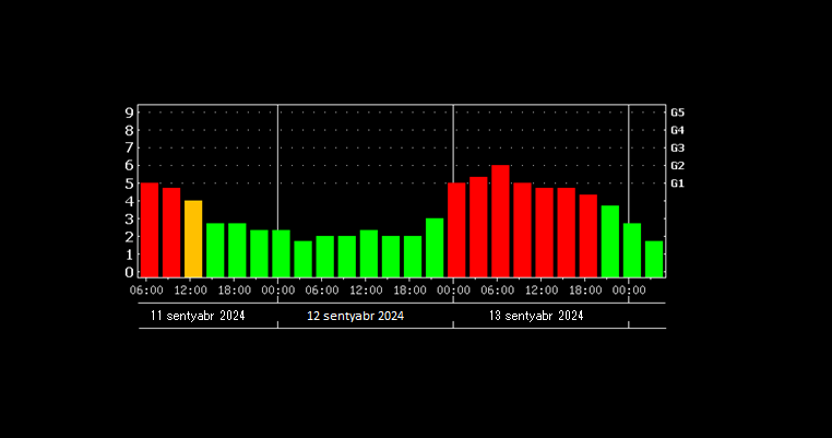 По информации, предоставленной кафедрой астрофизики физического факультета Бакинского государственного университета (БГУ), произошедший 10 сентября выброс корональной массы создаст на Земле геомагнитную бурю, которая начнется со второй половины дня 12 сентября и продлится примерно до 18 часов 13 сентября. В эти даты можно наблюдать перебои в радиосигналах, их передаче и приеме. В настоящее время геомагнитное поле спокойное и нестабильное. Последствия выброса корональной массы ощутятся на Земле 12-13 сентября. Уровень геомагнитной бури в ночь на 12 сентября составит G1 (слабая), G2 (умеренная) до 08:00 13 сентября и G1 до 20:00. Далее геомагнитное поле вернется на спокойный уровень.