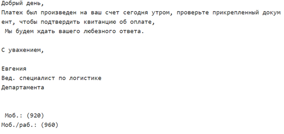 Пример вредоносного письма на русском языке
